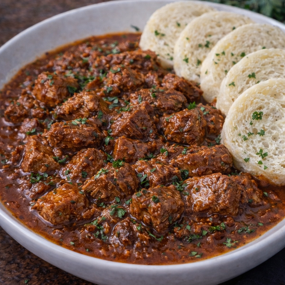 Tradičný hovädzí guláš z hovädzieho mäsa, dochutený cibuľou a paprikou.