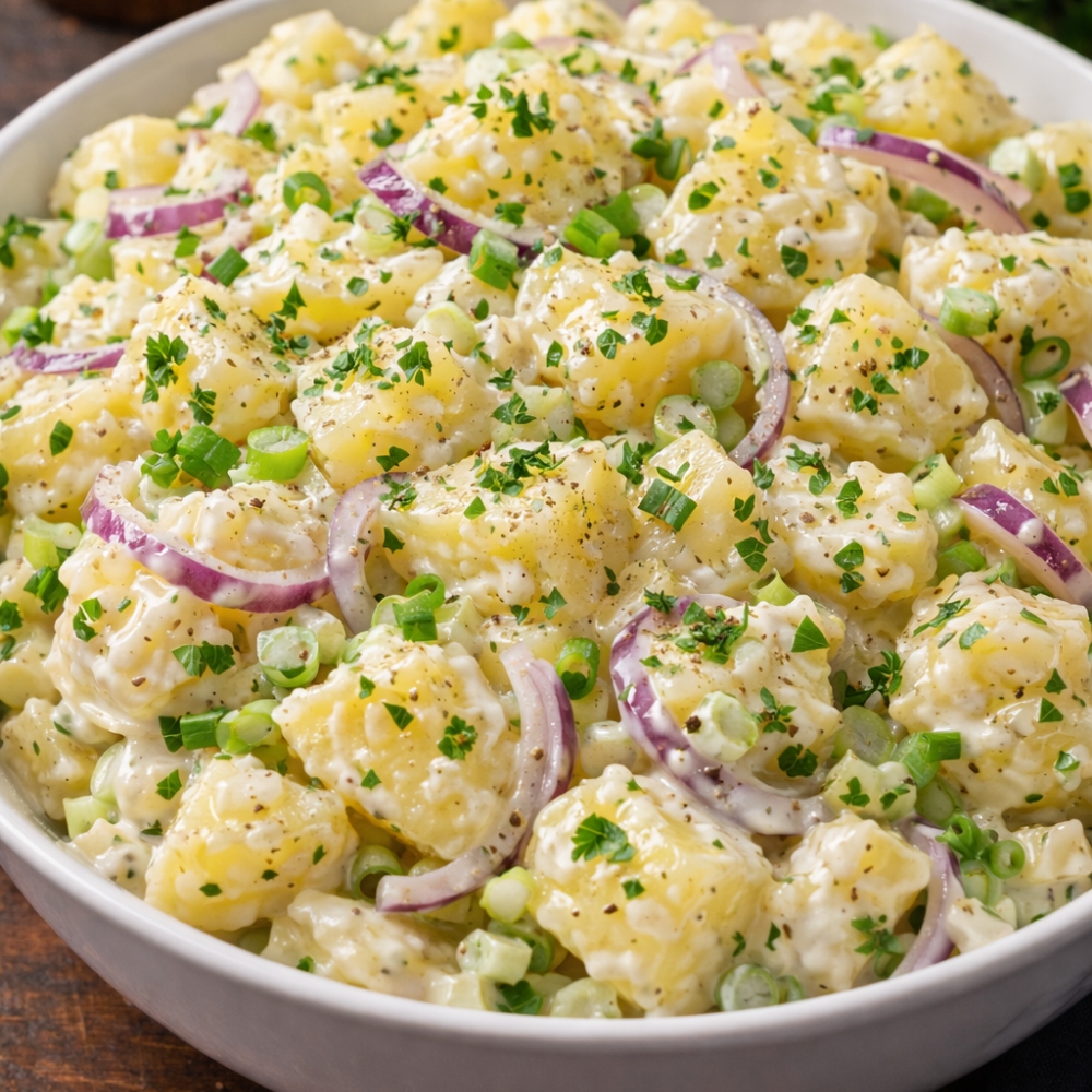 Tradičný zemiakový šalát s majonézou, vhodný ako príloha k mäsovým jedlám.